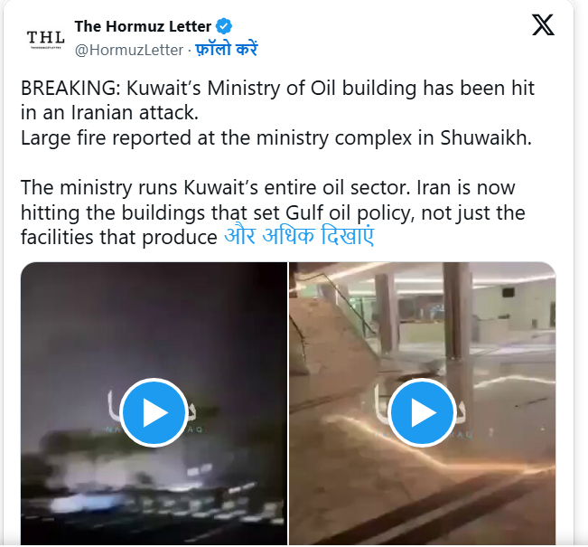 ਈਰਾਨ ਨੇ ਐਤਵਾਰ ਨੂੰ ਕੁਵੈਤ ਵਿੱਚ ਕਈ ਇਮਾਰਤਾਂ ਨੂੰ ਨਿਸ਼ਾਨਾ ਬਣਾਇਆ। ਕੁਵੈਤ ਦੇ ਵਿੱਤ ਮੰਤਰਾਲੇ ਨੇ ਕਿਹਾ ਕਿ ਤੇਲ ਖੇਤਰ ਵਿੱਚ ਸਥਿਤ ਮੰਤਰਾਲੇ ਦੇ ਇੱਕ ਕੰਪਲੈਕਸ ‘ਤੇ ਹਮਲਾ ਕੀਤਾ ਗਿਆ। ਇਹ ਹਮਲਾ ਈਰਾਨੀ ਹਮਲਾਵਰਤਾ ਨੂੰ ਦਰਸਾਉਂਦਾ ਹੈ। ਉਨ੍ਹਾਂ ਨੇ ਡਰੋਨ ਹਮਲੇ ਕੀਤੇ, ਜਿਸ ਨਾਲ ਕਾਫ਼ੀ ਨੁਕਸਾਨ ਹੋਇਆ। ਹਮਲੇ ਦੀ ਇੱਕ ਵੀਡੀਓ ਵੀ ਸਾਂਝੀ ਕੀਤੀ ਗਈ ਹੈ, ਜਿਸ ਵਿੱਚ ਸ਼ੁਵੈਖ ਤੇਲ ਖੇਤਰ ਵਿੱਚ ਸਥਿਤ ਕੰਪਲੈਕਸ ਦਾ ਇੱਕ ਹਿੱਸਾ ਸੜਦਾ ਦਿਖਾਈ ਦੇ ਰਿਹਾ ਹੈ। ਕੰਪਲੈਕਸ ਵਿੱਚੋਂ ਅੱਗ ਦੀਆਂ ਲਪਟਾਂ ਉੱਠਦੀਆਂ ਦਿਖਾਈ ਦੇ ਰਹੀਆਂ ਹਨ। ਅਧਿਕਾਰੀਆਂ ਨੇ ਪੁਸ਼ਟੀ ਕੀਤੀ ਹੈ ਕਿ ਹਮਲੇ ਵਿੱਚ ਹੁਣ ਤੱਕ ਕਿਸੇ ਜਾਨੀ ਨੁਕਸਾਨ ਦੀ ਕੋਈ ਰਿਪੋਰਟ ਨਹੀਂ ਹੈ।