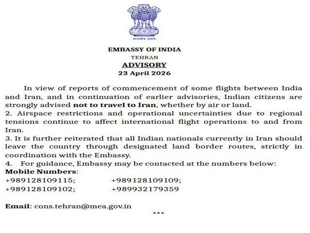 ਤਹਿਰਾਨ, 22 ਅਪ੍ਰੈਲ – ਤਹਿਰਾਨ ਸਥਿਤ ਭਾਰਤੀ ਦੂਤਾਵਾਸ ਨੇ ਭਾਰਤੀ ਨਾਗਰਿਕਾਂ ਨੂੰ ਹਵਾਈ ਜਾਂ ਜ਼ਮੀਨੀ ਰਸਤੇ ਈਰਾਨ ਦੀ ਯਾਤਰਾ ਨਾ ਕਰਨ ਦੀ ਸਲਾਹ ਦਿੱਤੀ ਹੈ। ਵਧਦੇ ਖੇਤਰੀ ਤਣਾਅ ਦੇ ਵਿਚਕਾਰ ਭਾਰਤ ਸਰਕਾਰ ਨੇ ਈਰਾਨ ਵਿਚ ਆਪਣੇ ਨਾਗਰਿਕਾਂ ਲਈ ਇਕ ਸਖ਼ਤ ਸਲਾਹ ਜਾਰੀ ਕੀਤੀ ਹੈ। ਤਹਿਰਾਨ ਵਿਚ ਭਾਰਤੀ ਦੂਤਾਵਾਸ ਨੇ ਸਪੱਸ਼ਟ ਤੌਰ ‘ਤੇ ਕਿਹਾ ਹੈ ਕਿ ਭਾਰਤੀ ਨਾਗਰਿਕਾਂ ਨੂੰ ਇਸ ਸਮੇਂ ਈਰਾਨ ਦੀ ਯਾਤਰਾ ਕਰਨ ਤੋਂ ਬਚਣਾ ਚਾਹੀਦਾ ਹੈ, ਭਾਵੇਂ ਉਹ ਹਵਾਈ ਜਾਂ ਸੜਕੀ ਯਾਤਰਾ ਰਾਹੀਂ ਹੋਵੇ। ਭਾਰਤ ਅਤੇ ਈਰਾਨ ਵਿਚਕਾਰ ਕੁਝ ਉਡਾਣਾਂ ਮੁੜ ਸ਼ੁਰੂ ਹੋਣ ਦੀਆਂ ਰਿਪੋਰਟਾਂ ਸਾਹਮਣੇ ਆ ਰਹੀਆਂ ਹਨ, ਅਜਿੇ ਵਿਚ ਦੂਤਾਵਾਸ ਵਲੋਂ ਇਹ ਸਲਾਹ ਜਾਰੀ ਕੀਤੀ ਗਈ ਹੈ । ਸਰਕਾਰ ਨੇ ਸਪੱਸ਼ਟ ਕੀਤਾ ਹੈ ਕਿ ਮੌਜੂਦਾ ਸਥਿਤੀ ਨੂੰ ਦੇਖਦੇ ਹੋਏ ਯਾਤਰਾ ਜੋਖਮ ਭਰੀ ਹੋ ਸਕਦੀ ਹੈ।