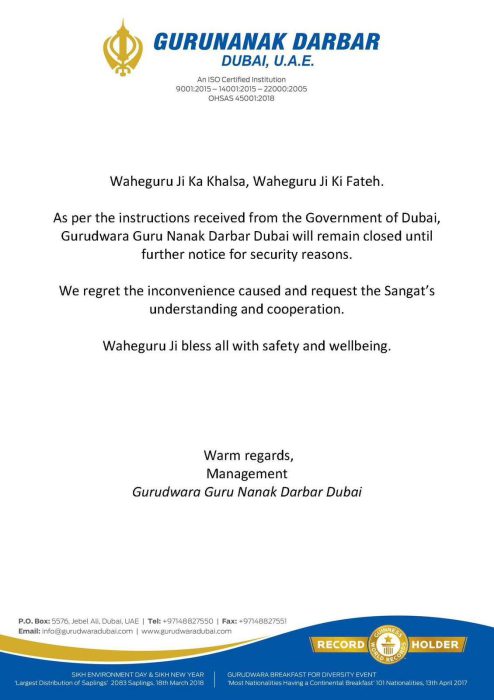 ਸ਼ਰਧਾਲੂਆਂ ਲਈ ਇੱਕ ਜਾਰੀ ਬਿਆਨ ਵਿੱਚ ਕਿਹਾ ਗਿਆ ਹੈ ਕਿ ਸੁਰੱਖਿਆ ਕਾਰਨਾਂ ਦੇ ਚਲਦਿਆਂ ਗੁਰਦੁਆਰਾ ਸਾਹਿਬ ਅਤੇ ਹਿੰਦੂ ਮੰਦਰ ਨੂੰ ਅਗਲੀ ਸੂਚਨਾ ਤੱਕ ਬੰਦ ਕੀਤਾ ਗਿਆ ਹੈ। ਪ੍ਰਬੰਧਕਾਂ ਨੇ ਇਸ ਲਈ ਮਾਫੀ ਮੰਗੀ ਹੈ ਅਤੇ ਸ਼ਰਧਾਲੂਆਂ ਤੋਂ ਸਹਿਯੋਗ ਦੀ ਅਪੀਲ ਕੀਤੀ। ਉਨ੍ਹਾਂ ਨਾਲ ਹੀ ਸਾਰੇ ਸ਼ਰਧਾਲੂਆਂ ਦੀ ਸੁਰੱਖਿਆ ਲਈ ਵੀ ਅਰਦਾਸ ਕੀਤੀ। ਉਧਰ, ਗੁਰੂ ਨਾਨਕ ਦਰਬਾਰ ਗੁਰਦੁਆਰਾ ਦੁਬਈ ਦੇ ਚੇਅਰਮੈਨ ਸੁਰਿੰਦਰ ਸਿੰਘ ਕੰਧਾਰੀ ਨੇ ਪੁਸ਼ਟੀ ਕੀਤੀ ਕਿ ਗੁਰਦੁਆਰੇ ਨੂੰ ਵੀ ਆਪਣੇ ਦਰਵਾਜ਼ੇ ਬੰਦ ਕਰਨ ਦੇ ਨਿਰਦੇਸ਼ ਮਿਲੇ ਹਨ। ਉਨ੍ਹਾਂ ਕਿਹਾ, “ਸਾਨੂੰ ਦੁਬਈ ਦੀ ਕਮਿਊਨਿਟੀ ਡਿਵੈਲਪਮੈਂਟ ਅਥਾਰਟੀ (ਸੀਡੀਏ) ਤੋਂ ਗੁਰਦੁਆਰੇ ਨੂੰ ਬੰਦ ਕਰਨ ਦੇ ਨਿਰਦੇਸ਼ ਮਿਲੇ ਹਨ। ਸੀਡੀਏ ਨੇ ਸੁਰੱਖਿਆ ਕਾਰਨਾਂ ਕਰਕੇ ਸਾਵਧਾਨੀ ਵਜੋਂ ਸਾਨੂੰ ਬੰਦ ਕਰਨ ਲਈ ਕਿਹਾ ਹੈ।”