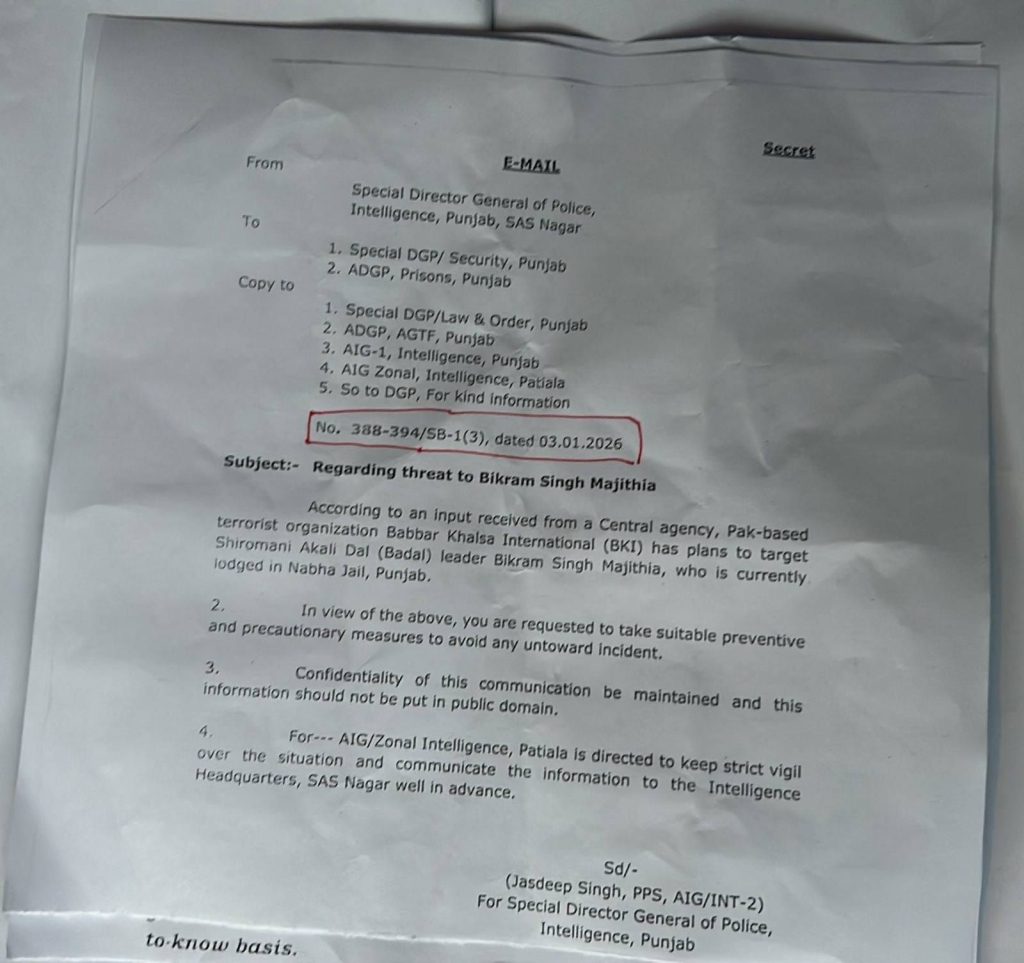ਇੱਕ ਕੇਂਦਰੀ ਏਜੰਸੀ ਤੋਂ ਮਿਲੀ ਗੁਪਤ ਜਾਣਕਾਰੀ ਤੋਂ ਬਾਅਦ ਪੰਜਾਬ ਪੁਲਸ ਦੇ ਸਪੈਸ਼ਲ ਡਾਇਰੈਕਟਰ ਜਨਰਲ ਆਫ਼ ਪੁਲਸ (ਇੰਟੈਲੀਜੈਂਸ) ਨੇ ਇੱਕ ਅਹਿਮ ਈ-ਮੇਲ ਜਾਰੀ ਕੀਤੀ ਹੈ। ਇਸ ਰਿਪੋਰਟ ਵਿੱਚ ਖੁਲਾਸਾ ਕੀਤਾ ਗਿਆ ਹੈ ਕਿ ਪਾਕਿਸਤਾਨ ਅਧਾਰਿਤ ਅੱਤਵਾਦੀ ਸੰਗਠਨ ਬੱਬਰ ਖਾਲਸਾ ਇੰਟਰਨੈਸ਼ਨਲ (BKI) ਬਿਕਰਮ ਸਿੰਘ ਮਜੀਠੀਆ ਨੂੰ ਨਿਸ਼ਾਨਾ ਬਣਾਉਣ ਦੀ ਯੋਜਨਾ ਬਣਾ ਰਿਹਾ ਹੈ।  ਮਜੀਠੀਆ ਇਸ ਵੇਲੇ ਪੰਜਾਬ ਦੀ ਨਾਭਾ ਜੇਲ੍ਹ ਵਿੱਚ ਬੰਦ ਹਨ।3 ਜਨਵਰੀ 2026 ਨੂੰ ਜਾਰੀ ਕੀਤੇ ਗਏ ਇਸ ਨੋਟਿਸ ਰਾਹੀਂ ਇੰਟੈਲੀਜੈਂਸ ਵਿਭਾਗ ਨੇ ਸਪੈਸ਼ਲ ਡੀ.ਜੀ.ਪੀ. (ਸੁਰੱਖਿਆ), ਏ.ਡੀ.ਜੀ.ਪੀ. (ਜੇਲ੍ਹ), ਅਤੇ ਐਂਟੀ ਗੈਂਗਸਟਰ ਟਾਸਕ ਫੋਰਸ (AGTF) ਸਮੇਤ ਕਈ ਉੱਚ ਅਧਿਕਾਰੀਆਂ ਨੂੰ ਸੁਚੇਤ ਕੀਤਾ ਹੈ। ਪੱਤਰ ਵਿੱਚ ਸਪੱਸ਼ਟ ਹਦਾਇਤਾਂ ਦਿੱਤੀਆਂ ਗਈਆਂ ਹਨ ਕਿ: