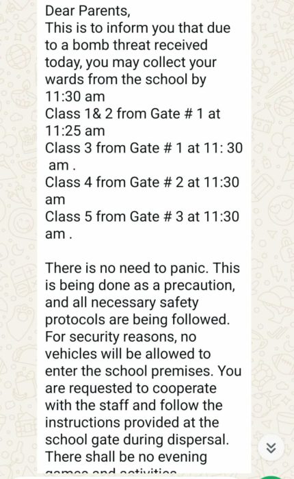 ਧਮਕੀ ਭਰੀ ਈ-ਮੇਲ ਮਿਲਦਿਆਂ ਹੀ ਬੱਚਿਆਂ ਨੂੰ ਘਰ ਭੇਜਿਆ ਗਿਆ ਹੈ ਤੇ ਪੁਲਿਸ ਦੀਆਂ ਟੀਮਾਂ ਵੱਲੋਂ ਜਾਂਚ ਕੀਤੀ ਜਾ ਰਹੀ ਹੈ। ਅਧਿਆਪਕਾਂ ਵੱਲੋਂ ਮਾਪਿਆਂ ਨੂੰ ਮੈਸੇਜ ਭੇਜਿਆ ਗਿਆ ਤੇ ਨਾਲ ਹੀ ਸਹਿਯੋਗ ਦੇਣ ਦੀ ਵੀ ਅਪੀਲ ਕੀਤੀ। ਅਧਿਆਪਕਾਂ ਨੇ ਅਪੀਲ ਕੀਤੀ ਕਿ ਪੈਨਿਕ ਨਾ ਹੋਇਆ ਜਾਵੇ। ਪਟਿਆਲਾ ਪ੍ਰਸ਼ਾਸਨ ਹੁਣ ਪੂਰੀ ਤਰ੍ਹਾ ਤੋਂ ਅਲਰਟ ਹੈ। ਹਾਲਾਂਕਿ ਇਹ ਈ-ਮੇਲ ਸਹੀ ਹੈ ਜਾਂ ਗਲਤ ਇਹ ਅਜੇ ਜਾਂਚ ਦਾ ਵਿਸ਼ਾ ਹੈ।