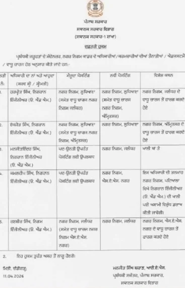 ਪੰਜਾਬ ‘ਚ ਨਗਰ ਨਿਗਮ ਅਧਿਕਾਰੀਆਂ ਦੇ ਅਚਾਨਕ ਤਬਾਦਲੇ