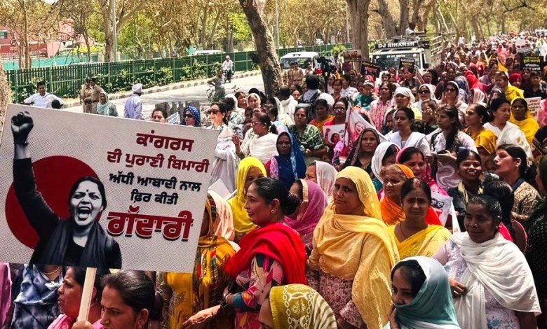 ਤੀਖੀ ਗਰਮੀ ਦੇ ਬਾਵਜੂਦ, ਪੰਜਾਬ ਭਰ ਤੋਂ ਸੈਂਕੜੇ ਮਹਿਲਾਵਾਂ, ਭਾਜਪਾ ਪੰਜਾਬ ਦੇ ਵਰਕਿੰਗ ਸੂਬਾ ਪ੍ਰਧਾਨ ਅਸ਼ਵਨੀ ਸ਼ਰਮਾ ਦੀ ਅਗਵਾਈ ਹੇਠ, ਮੁੱਖ ਮੰਤਰੀ ਭਗਵੰਤ ਮਾਨ ਦੇ ਨਿਵਾਸ ਵੱਲ ਮਾਰਚ ਕਰਦੀਆਂ ਹੋਈਆਂ, ਆਮ ਆਦਮੀ ਪਾਰਟੀ ਤੋਂ ਨਾਰੀ ਸ਼ਕਤੀ ਵੰਦਨ ਅਧਿਨਿਯਮ—ਜੋ ਸੰਸਦ ਅਤੇ ਰਾਜ ਵਿਧਾਨ ਸਭਾਵਾਂ ਵਿੱਚ ਮਹਿਲਾਵਾਂ ਨੂੰ 33% ਰਿਜ਼ਰਵੇਸ਼ਨ ਪ੍ਰਦਾਨ ਕਰਦਾ ਹੈ—ਦੇ ਵਿਰੋਧ ਬਾਰੇ ਜਵਾਬ ਮੰਗ ਰਹੀਆਂ ਸਨ।