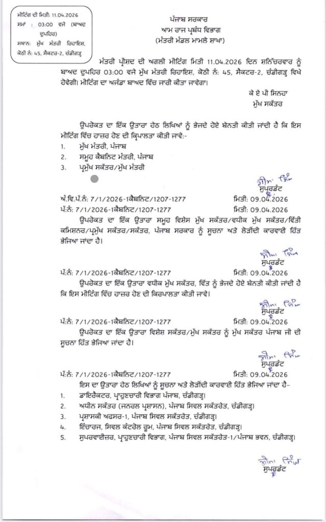 ਪੰਜਾਬ ਸਰਕਾਰ ਨੇ 13 ਅਪ੍ਰੈਲ ਨੂੰ ਵਿਸਾਖੀ ਲਈ ਹੋਣ ਵਾਲੇ ਵਿਸ਼ੇਸ਼ ਵਿਧਾਨ ਸਭਾ ਸੈਸ਼ਨ ਤੋਂ ਪਹਿਲਾਂ ਕੈਬਨਿਟ ਮੀਟਿੰਗ ਬੁਲਾਉਣ ਦਾ ਫੈਸਲਾ ਕੀਤਾ ਹੈ। ਇਹ ਮੀਟਿੰਗ ਮੁੱਖ ਮੰਤਰੀ ਦੀ ਸਰਕਾਰੀ ਰਿਹਾਇਸ਼ ‘ਤੇ ਦੁਪਹਿਰ 3 ਵਜੇ ਹੋਵੇਗੀ। ਮੀਟਿੰਗ ਦੌਰਾਨ ਵਿਸ਼ੇਸ਼ ਵਿਧਾਨ ਸਭਾ ਸੈਸ਼ਨ ਨੂੰ ਵੀ ਰਸਮੀ ਤੌਰ ‘ਤੇ ਪ੍ਰਵਾਨਗੀ ਦਿੱਤੀ ਜਾਵੇਗੀ।ਸਰਕਾਰ ਵੱਲੋਂ ਮੀਟਿੰਗ ਵਿੱਚ ਕਈ ਮਹੱਤਵਪੂਰਨ ਪ੍ਰਸਤਾਵਾਂ ਨੂੰ ਵੀ ਮਨਜ਼ੂਰੀ ਦਿੱਤੇ ਜਾਣ ਦੀ ਸੰਭਾਵਨਾ ਹੈ। ਮੰਨਿਆ ਜਾ ਰਿਹਾ ਹੈ ਕਿ ਇਹ ਪ੍ਰਸਤਾਵ ਸੂਬੇ ਦੇ ਪ੍ਰਸ਼ਾਸਕੀ ਅਤੇ ਜਨਤਕ ਹਿੱਤ ਦੇ ਮੁੱਦਿਆਂ ਨਾਲ ਸਬੰਧਤ ਹੋ ਸਕਦੇ ਹਨ। ਦੱਸ ਦੇਈਏ ਕਿ ਇਹ ਵਿਸ਼ੇਸ਼ ਸੈਸ਼ਨ ਬੇਅਦਬੀ ਦੇ ਮਾਮਲਿਆਂ ਖਿਲਾਫ ਸਖ਼ਤ ਕਾਨੂੰਨ ਬਣਾਊਣ ਨੂੰ ਲੈ ਕੇ ਸੱਦਿਆ ਜਾ ਰਿਹਾ ਹੈ।