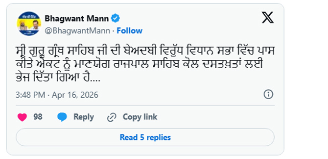 ਪੰਜਾਬ ਸਰਕਾਰ ਦੀ ਇੱਕ ਮਹੱਤਵਪੂਰਨ ਕੈਬਨਿਟ ਮੀਟਿੰਗ ਅੱਜ, ਸ਼ੁੱਕਰਵਾਰ ਨੂੰ ਮੁੱਖ ਮੰਤਰੀ ਨਿਵਾਸ ‘ਤੇ ਹੋਣ ਵਾਲੀ ਹੈ। ਮੀਟਿੰਗ ਤੋਂ ਪਹਿਲਾਂ, ਮੁੱਖ ਮੰਤਰੀ ਭਗਵੰਤ ਮਾਨ ਨੇ ਆਪਣੇ ਸੋਸ਼ਲ ਮੀਡੀਆ ਅਕਾਊਂਟ, ‘X’ ‘ਤੇ ਐਲਾਨ ਕੀਤਾ ਕਿ ਸ੍ਰੀ ਗੁਰੂ ਗ੍ਰੰਥ ਸਾਹਿਬ ਜੀ ਦੀ ਬੇਅਦਬੀ ਨਾਲ ਸਬੰਧਤ ਮਾਮਲਿਆਂ ਸੰਬੰਧੀ ਵਿਧਾਨ ਸਭਾ ਵੱਲੋਂ ਪਾਸ ਕੀਤਾ ਗਿਆ ਬਿੱਲ ਰਾਜਪਾਲ ਨੂੰ ਭੇਜ ਦਿੱਤਾ ਗਿਆ ਹੈ।